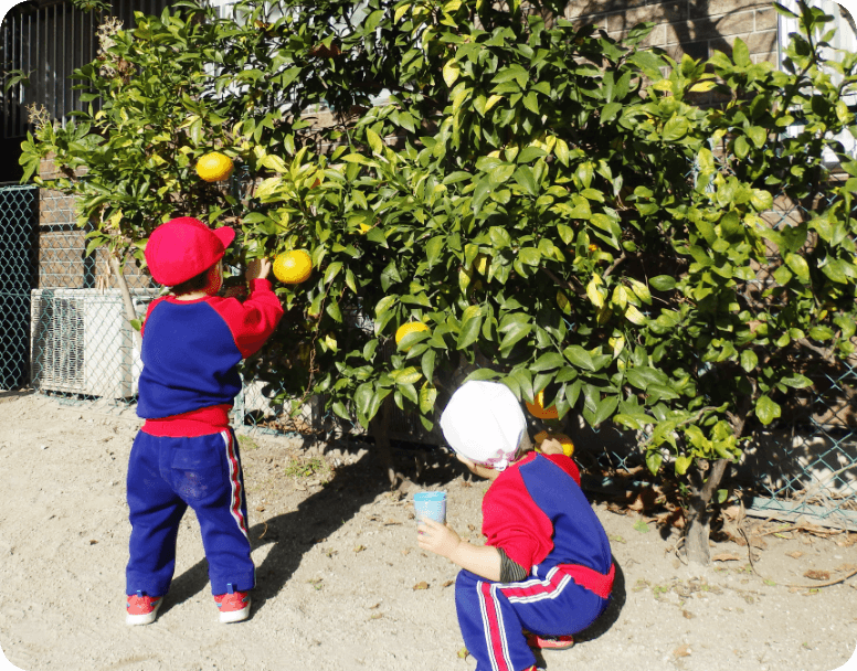 園内菜園に加え、園庭でりんご、もも、かき、みかんなどたくさんの果物を育てています。