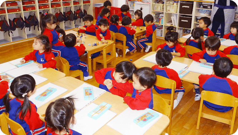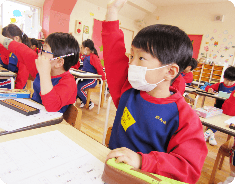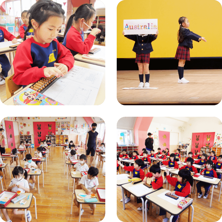 年齢に応じたカリキュラムを用意しています。 年少から英会話、年長ではそろばんや、外国人教師による英会話を行っています。