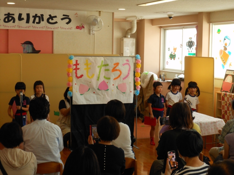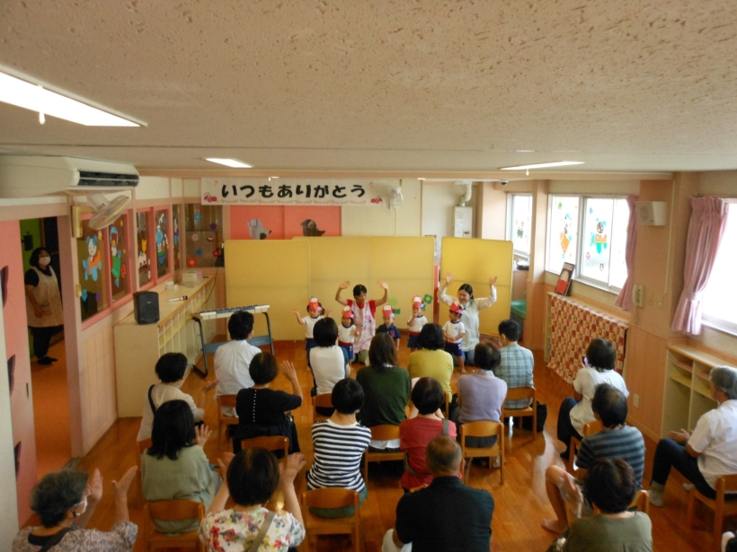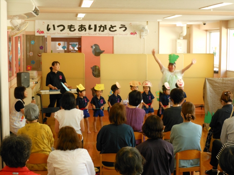 歌を一緒に歌ったり、手遊びをしたり、劇を見て頂いたり。。。