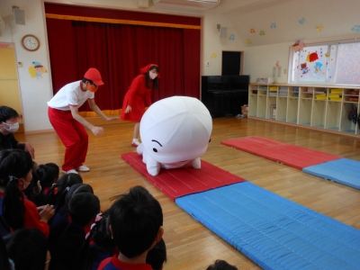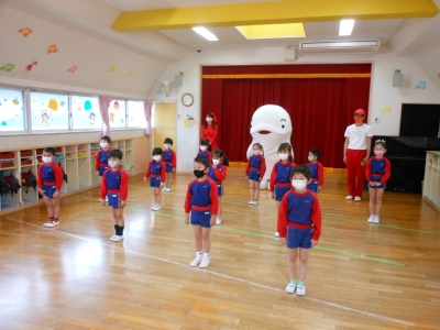 さくら組、ゆり組、ばら組のみんながメリ夫くんと元気いっぱいに体操しました。
