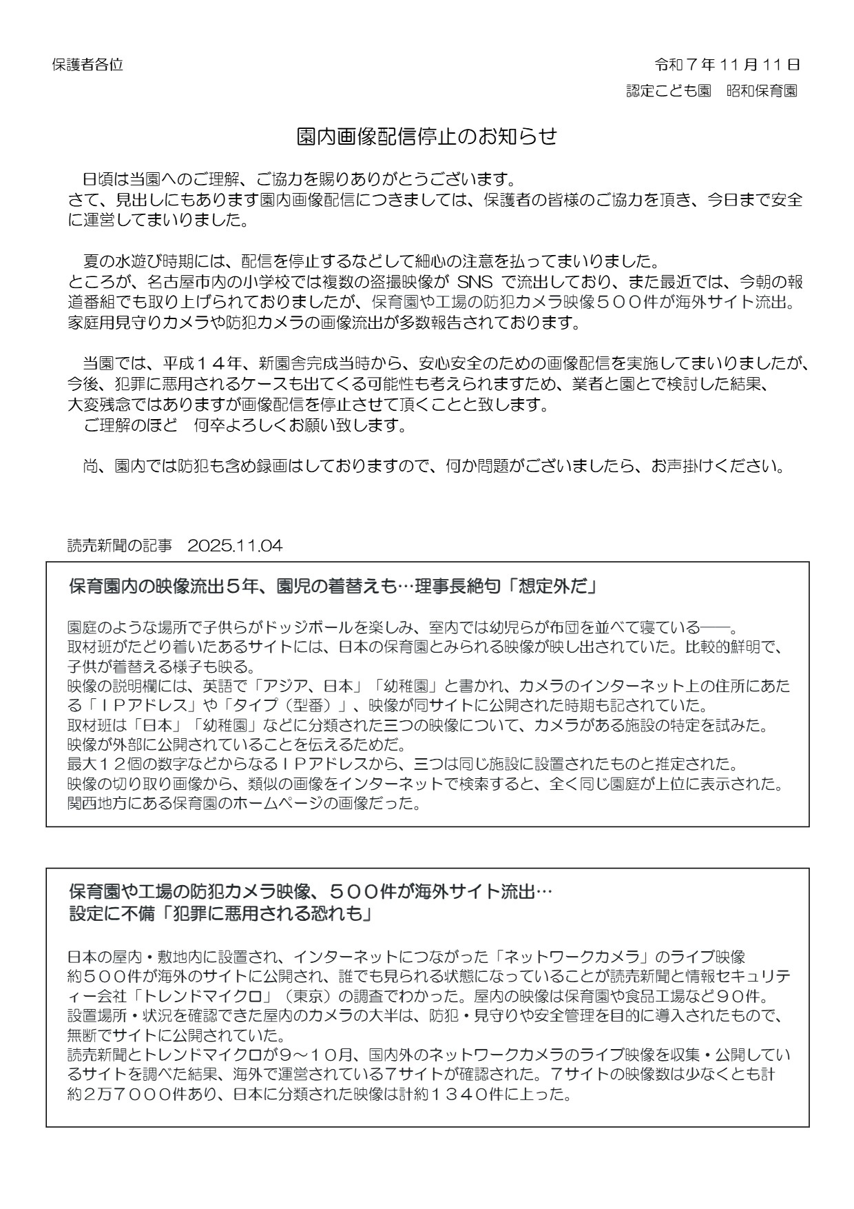 当園では、平成14年、新園舎完成当時から、安心安全のための画像配信を実施してまいりましたが、今後、犯罪に悪用されるケースも出てくる可能性も考えられますため、業者と園とで検討した結果、大変残念ではありますが画像配信を停止させて頂くことと致します。